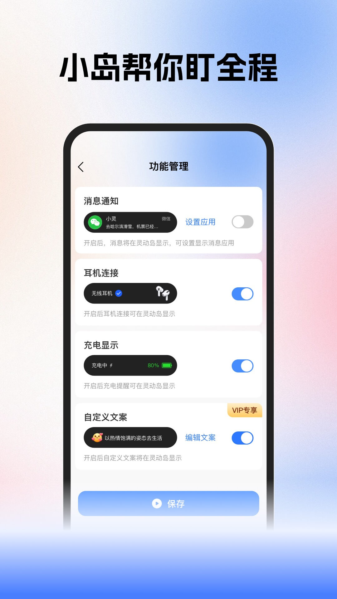 灵动岛消息聚合:微信等重要通知置顶悬浮,无需解锁,信息一眼掌握。
