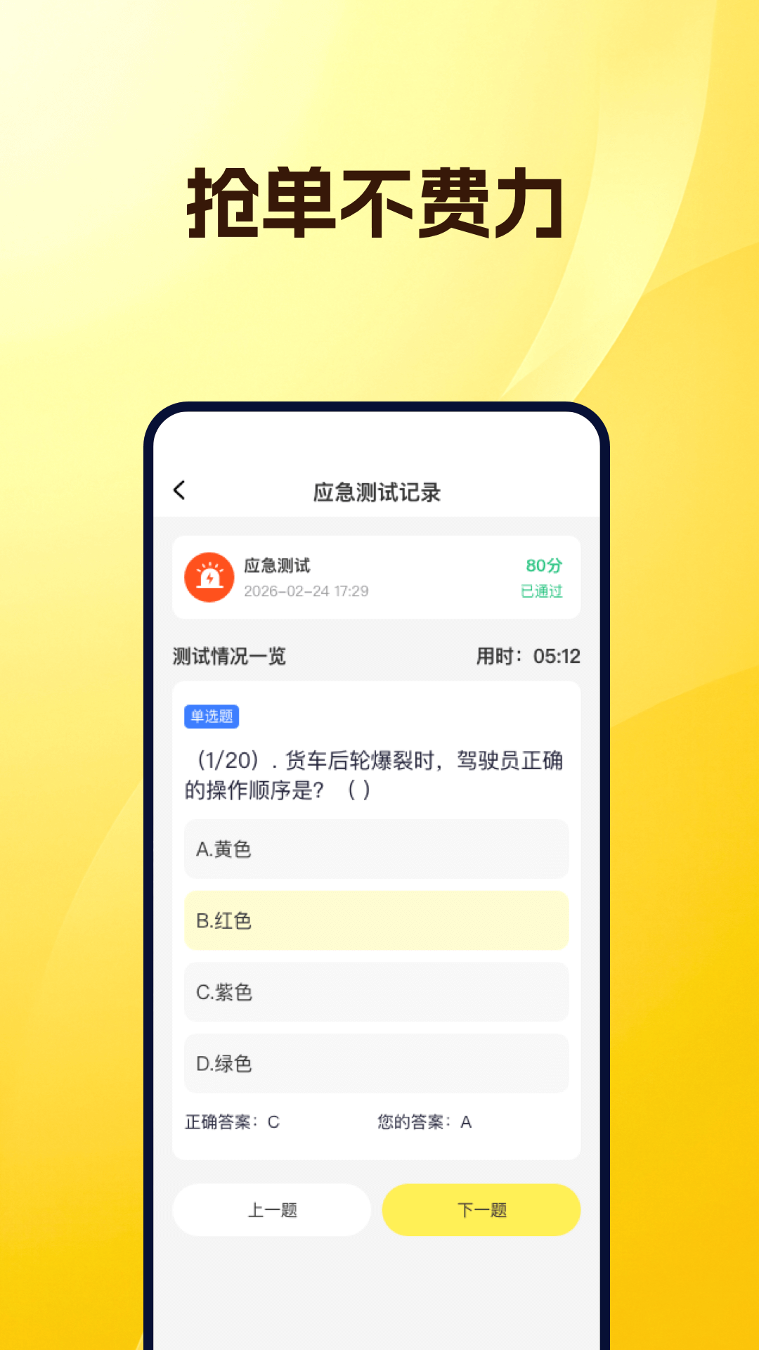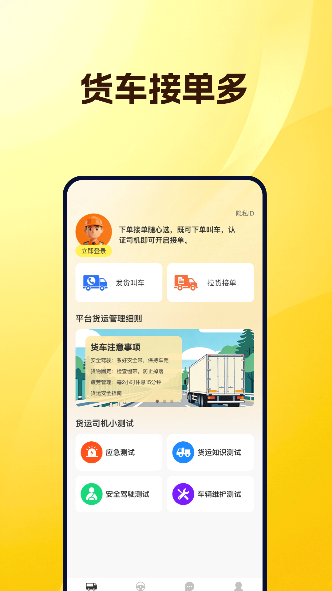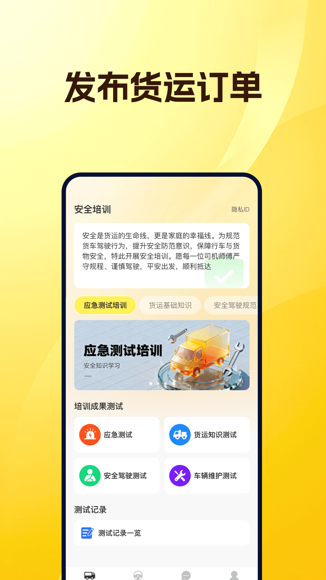 本应用提供司机认证与接单服务,系统将实时返回认证结果,司机认证通过后可在平台接单并查看订单信息。用户中心支持货主发布订单、查看订单列表等功能。订单详情页与我的消息页面均设有在线聊天入口,方便司机与货主实时沟通。我的消息页面还可展示货车司机当日接单量与收入数据。 应用新增安全培训模块,包含应急处置、货运基础、安全驾驶、车辆维护保养四大培训内容,并配套测试题用于检验学习成果,旨在规范驾驶行为、提升安全防范意识,全面保障行车与货物运输安全。